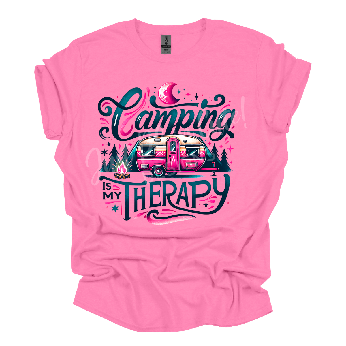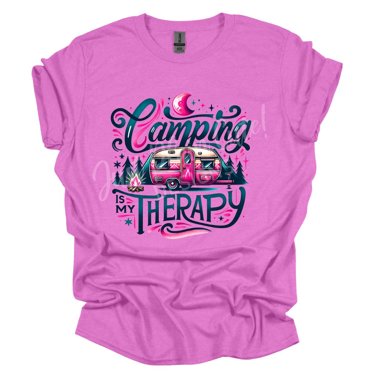 This is a vibrant Gildan G640 short-sleeve tee featuring a Navy and Hot Pink “Camping is my Therapy” design. Perfect for summer – pair with a cute pair of denim shorts, a lightweight pair of sandals, and a straw tote! Choose Azalea color or Heather Radiant Orchid – 100% pre-shrunk cotton.