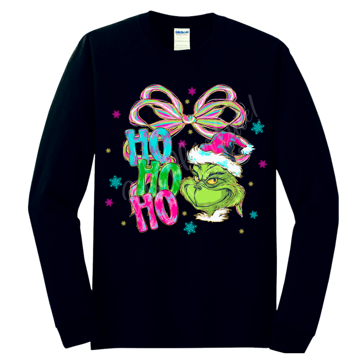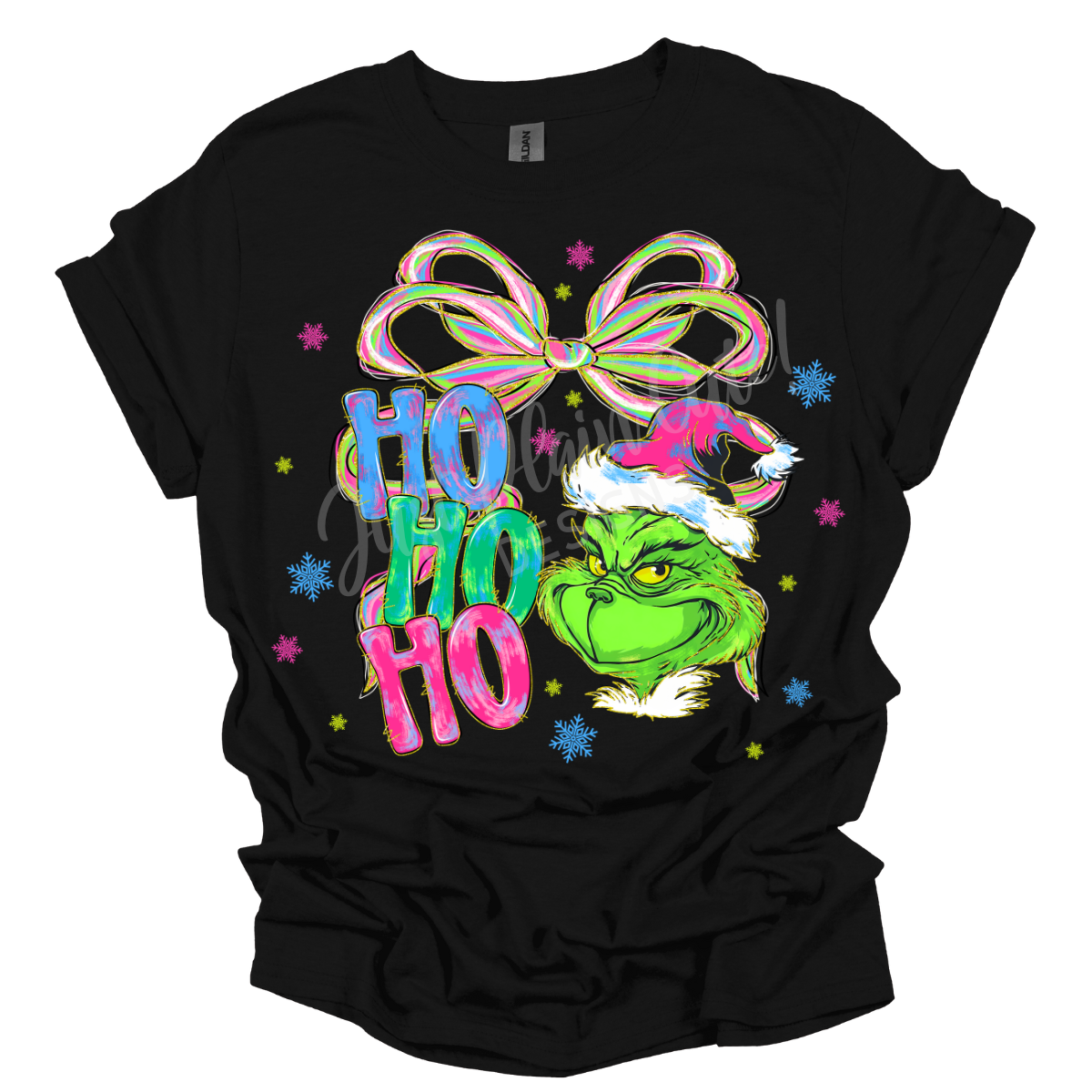 Who doesn’t love the Grinch? This adorable and brightly colored Ho Ho Ho Grinch (with coquette bow) on a black Gildan tee is perfect for any holiday occasion, school, or even a shopping trip! The tee is 100% pre-shrunk cotton. Available in both short and long-sleeves. Sizes Adult Small to 5XL.