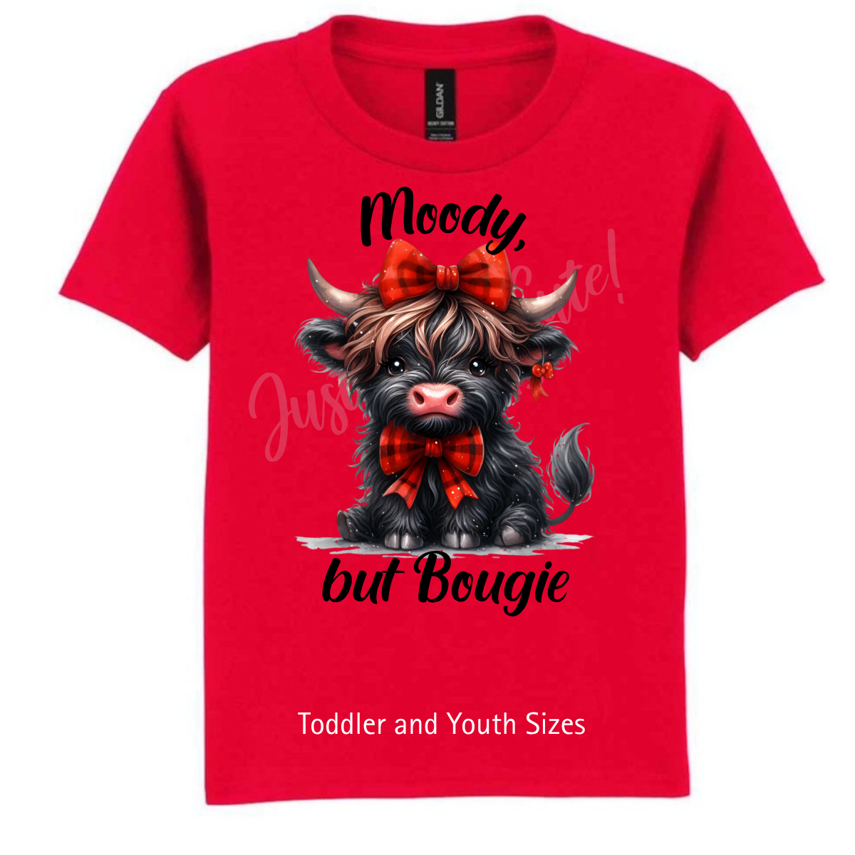 This cute black Highland cow in buffalo print is “Moody but Bougie”. The Red tee comes in Youth and Toddler sizes. Brand may be Gildan or Rabbit Skins, depending upon size and availability. Both brands are pre-shrunk cotton, but may also have a percentage of polyester.
