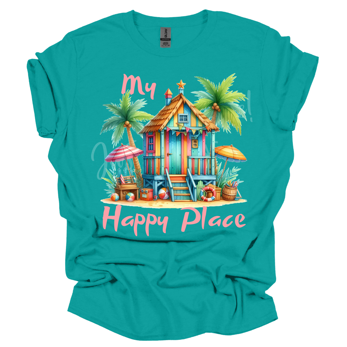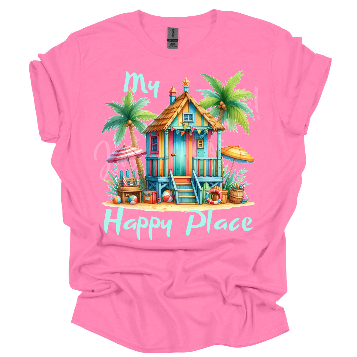 Our “My Happy Place” summer beach bungalow tee comes in two colors: Azalea (pink) and Jade Dome (other colors are available upon request). Both are Gildan 100% pre-shrunk cotton tees for a lightweight, cool, and and comfy wear for summer.