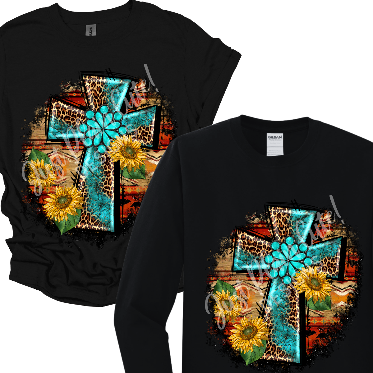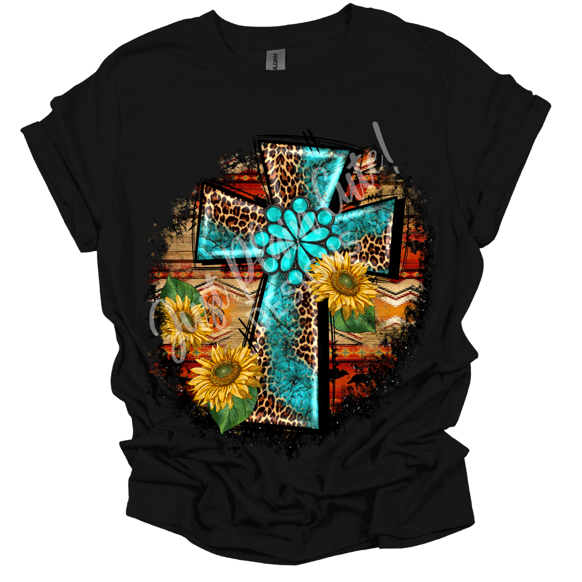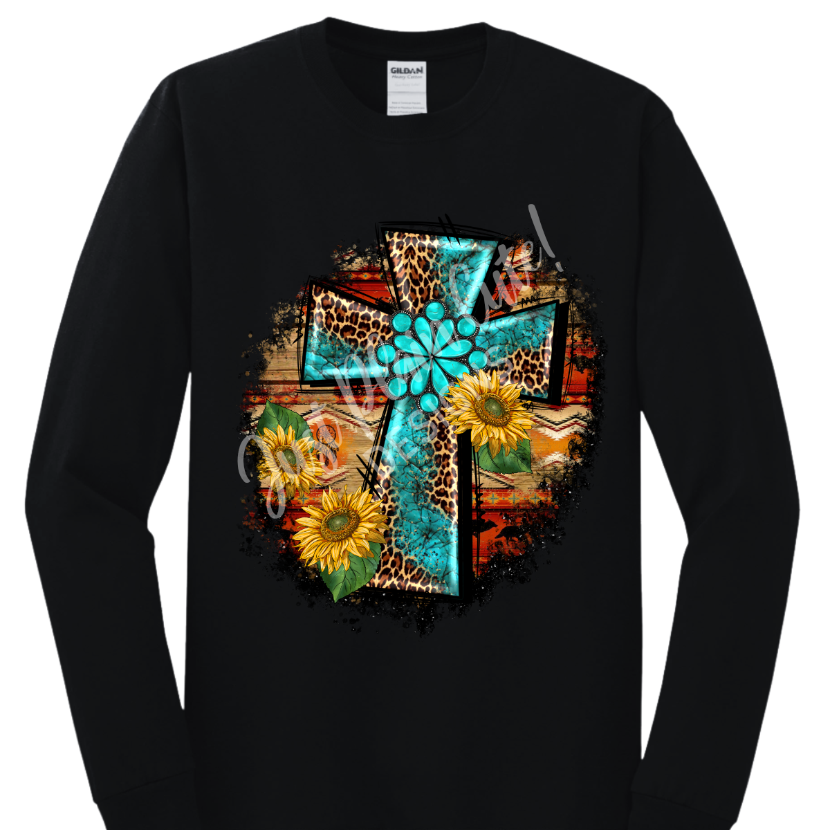 A vibrant turquoise Western cross, concho, serape, and golden sunflowers (in a gorgeous Western motif) make a simple but clear statement of your faith. This is a solid black 100% preshrunk cotton tee; available in short or long sleeves — Adult sizes Small to 5XL.