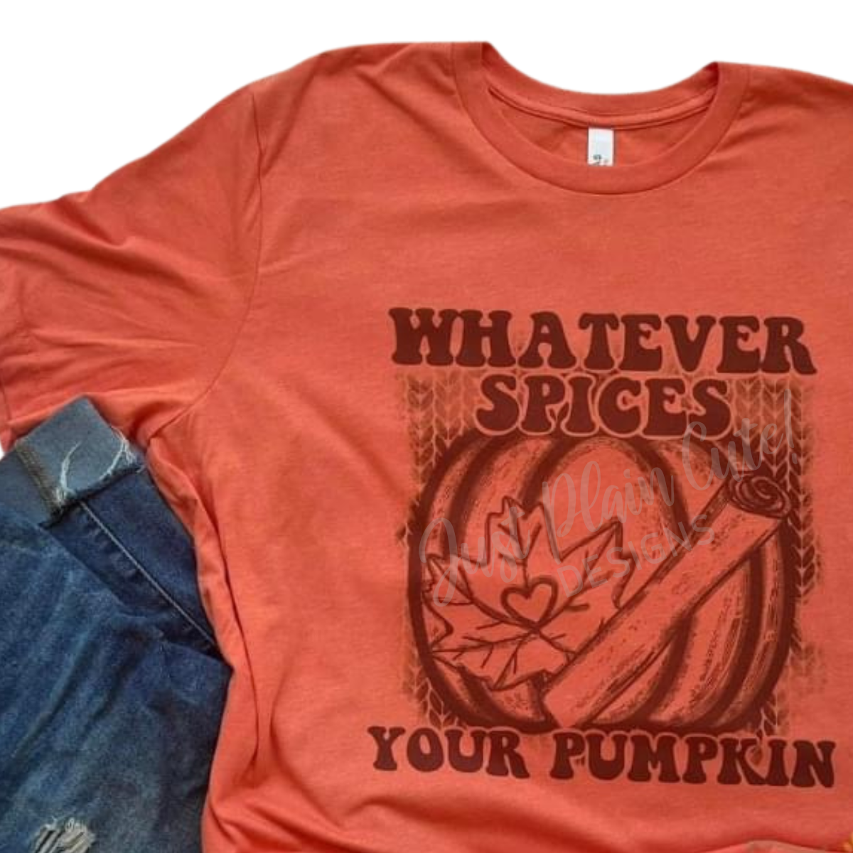 This Bella Canvas 3001CVC tee in Heather Orange features a sublimated minimalist dark brown “Whatever Spices your Pumpkin” graphic, giving the tee a slightly vintage look. 52% cotton, 48% polyester. Very FALL!